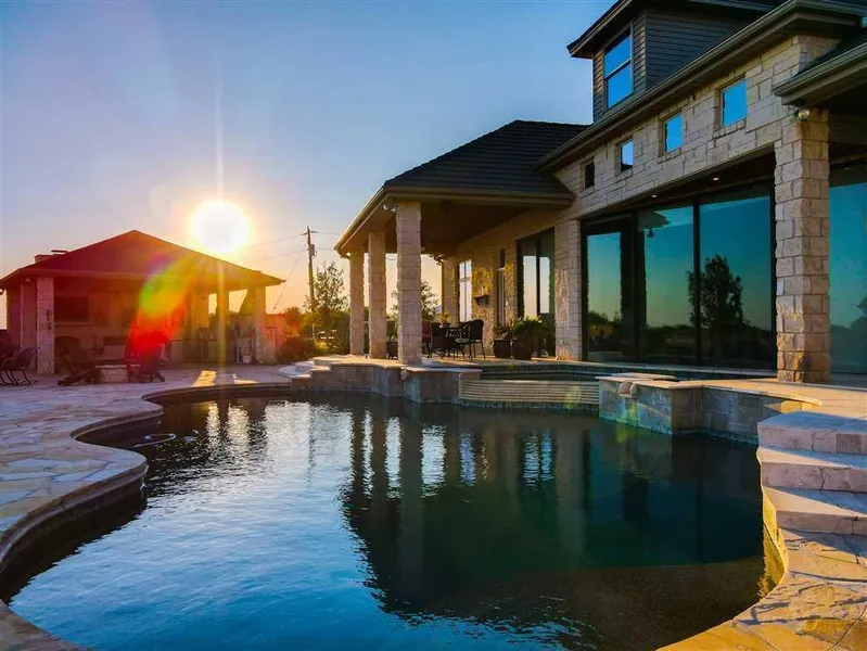 Luxury knows no bounds when it comes to this mixed use residential, recreational, ranchland 416.12 acre property outside of Holliday, TX 76366 in Archer County and the Holliday school district. The 4700 Sq. Ft. house was meticulously crafted and designed to offer all of the comforts your heart could desire, from the 3 bedrooms and 3 full baths to the open concept living room/dining room/kitchen. Marble, slate and hand scraped wood adorn the floors. The ceiling stretches to 16 Ft, while grand columns and archways add a degree of separation from living room to the game room/2nd living area. The home and shop have a built-in security system. Views through the large windows and French doors in the first floor master suite are breathtaking. The French doors lead directly to the swimming pool and backyard oasis. The master bath has a jetted tub, walk-in shower, a wall mounted fireplace, a huge walk-in closet with built-in storage and plenty of counter space. Natural sunlight streams through the south-facing wall of windows in the living room and master bedroom. The expanse of living room windows overlooks the swimming pool, outdoor kitchen cabana, fire pit, pasture and offers views of the lake. The kitchen is a chef's dream with floor to ceiling cabinets, granite counter tops, an island, gas range, a refrigerator that matches the cabinets, a walk-in pantry and a breakfast counter. The living room is not only embraced by the windows on the south and the columns to the north, but also has a gorgeous fireplace with built-in wall units on each side. At the front of the house is an extra living space, currently hosting a pool table. From the extra living space, a stairway will take you to the large upstairs bedroom. A third bedroom is located on the main floor next to the office. Down the hall from the office and 3rd bedroom is the theater room, complete with comfortable seating, a projection TV and a sound system. Recessed lighting and ceiling fans are throughout the home. The metal roof has a lifetime warranty. The three car garage also an abundance of storage and a 6 person sauna. A circle drive at the front of the home allows for plenty of parking.