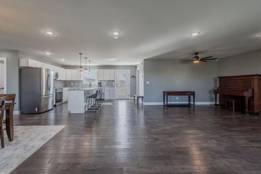 Discover country living at its finest with this beautiful 3 bedroom, 2 bathroom ranch-style home on 9.66 acres in Campbellsville, KY. Featuring an open floor plan with a split-bedroom design, this home offers both comfort and functionality. The spacious kitchen comes complete with all Samsung appliances, while the primary suite includes a double vanity, walk-in closets, a relaxing soaker tub, and a separate shower. Hardwood and tile floors run throughout, and each bedroom is generously sized with walk-in closets and built-in lighting. A full unfinished walkout basement provides endless possibilities for storage or future expansion. Enjoy the outdoors with a covered front porch, landscaped yard, a wonderful patio for entertaining, and two ponds on the property. The home also includes a side-entry 2-car attached garage, making it as practical as it is inviting. Located in a peaceful county farm area, this property offers the perfect blend of rural charm and modern convenience.