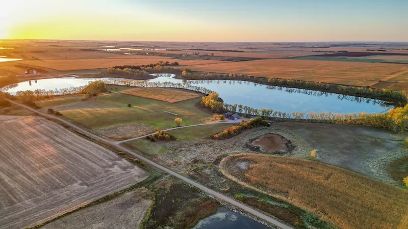 Located in McCook County, South Dakota, this 159.81 acre property offers a rare combination of residential comfort and recreational opportunity. Just minutes from I-90 Exit 357 and situated between Sioux Falls (approximately 45 miles east) and Mitchell (approximately 15 miles west), this unique offering provides convenient access to city amenities while offering a tranquil rural setting.At the heart of the property is a spacious and highly functional 4-bedroom, 3.5-bathroom home that overlooks a tree-lined private lake of approximately 64 acres. The home’s design emphasizes comfort and function, with oversized bedrooms, a geothermal heating and cooling system, and access to rural water. The primary suite includes direct access to a sunken hot tub positioned to take in sunrise or sunset views over the lake. A full-length deck, partially covered, provides ample space to enjoy the outdoors in all seasons. A fireplace on the main level and another under the covered deck add warmth and ambiance.The lake provides prime habitat for migrating waterfowl, with multiple coves that allow for hunting in various wind conditions. Beyond the lake, the surrounding landscape has been managed for upland and big game species, with a 4-acre corn food plot enhancing habitat for pheasants, deer, and turkeys. Whether for hunting, bird watching, or enjoying the peaceful views, the outdoor space supports a wide range of recreational uses.Additional improvements include a 32x45-foot metal shop with a concrete floor and electric service. This structure offers ample room for storing equipment, recreational vehicles, or hunting gear.The location of this property makes it well-suited as a year-round residence, recreational retreat, or part-time home base for outdoor enthusiasts. The natural features of the land and lake support consistent wildlife presence and seasonal migrations, adding ecological and recreational value.Nearby towns and cities include Alexandria (approx. 8 miles), Mitchell (15 miles), and Sioux Falls (45 miles), providing access to dining, shopping, schools, healthcare, and regional airports.With its combination of lakefront living, well-built residence, accessible location, and established wildlife habitat, this McCook County property presents a rare opportunity to own a sizable piece of South Dakota land with diverse use potential.
