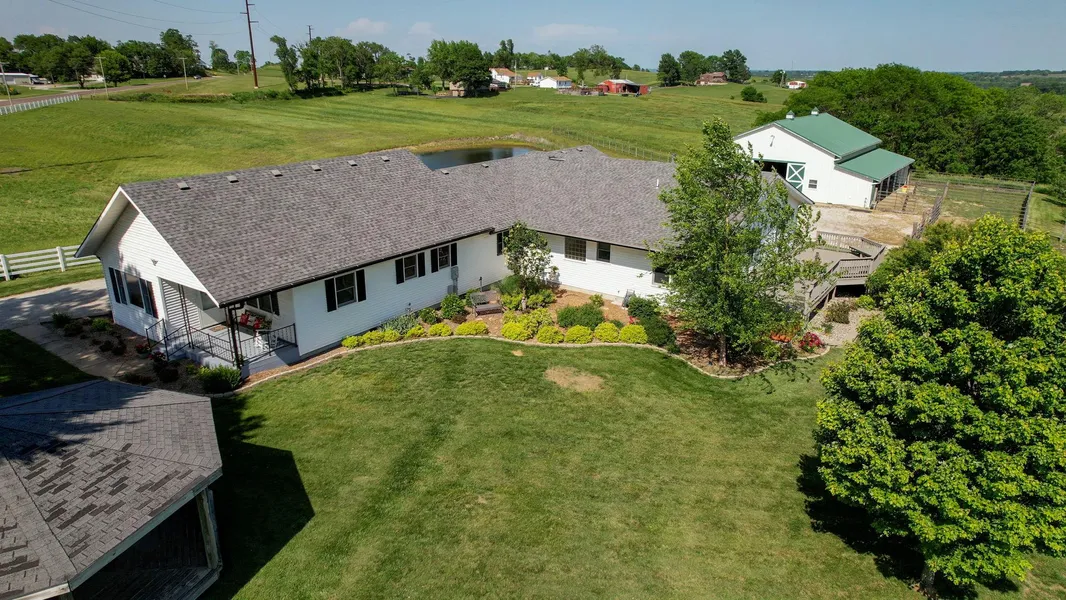 Attractive rural retreat welcomes you with its charm and tranquility. Situated on approximately 16 acres of land, this property offers the perfect blend of natural beauty and modern comforts. Embrace main level living in this spacious 3-bed, 3-bath home. A sizeable 2 car attached garage offers a work bench area as well. The cozy kitchen is equipped with modern appliances, ample counter space and beautiful cabinetry, a perfect spot for cooking hearty meals and having great conversations. Down the hall is the gorgeous addition offering the oversized primary bedroom and sitting room, both featuring a gas fireplace. Adjacent you will find the primary bathroom and large closet, along with an amazing sunroom. Right off the sunroom is the deck where the hot tub is located and ready for you to unwind and enjoy the beautiful views of the pasture. A charming gazebo offers the ideal setting for gatherings and celebrations. The property also includes a 60x40 barn with horse stalls, tack and feed room, and plenty of storage for equipment or hay. 2 ponds and a meandering creek, a lush tree line and the beautiful landscaping around the home offers and idyllic setting offers endless possibilities. Centrally located between, Topeka, Leavenworth, St. Joseph, KCI airport and KC itself. This property is sure to captivate your heart and soul. Come take a look!