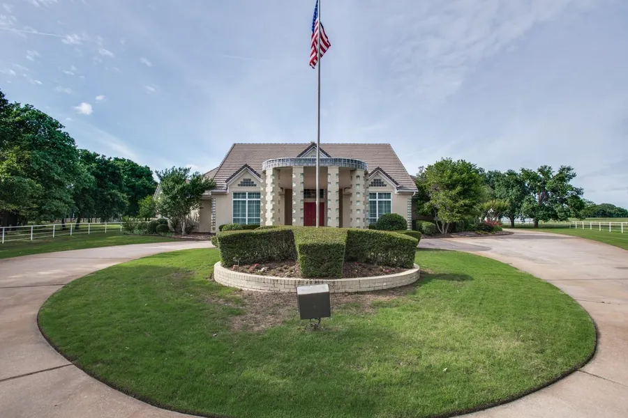 The main house sits well back from Historic Lane at the end of an asphalt drive lined with a pipe and cable fence. Completed in 1990, the 5,639 square foot custom home features a contemporary design with a horseshoe shaped floorplan that allows an abundance of light throughout the house. The large open kitchen, breakfast room and den overlook the landscaped backyard that includes a heated pool and separate spa. In addition to the 5 bedrooms with private baths, the home also includes a workout room, playroom, and two offices off a second floor balcony with panoramic views of the entire ranch. The first floor master suite includes separate his and hers bathrooms and a sitting area. A separate 1,566 sf building used as an office/guesthouse is nestled in a grove of tall oak trees with three walls of windows, a kitchenette, bathroom with shower and a wood-burning fireplace. A metal hangar and pad were built for the owners private helicopter in 2002. The home utilizes the Mustang Utility District for water and a 1,000 deep well and adjacent pond for irrigation. The land on the north and east side of the residence has been cleared and would be ideal for grazing horses.