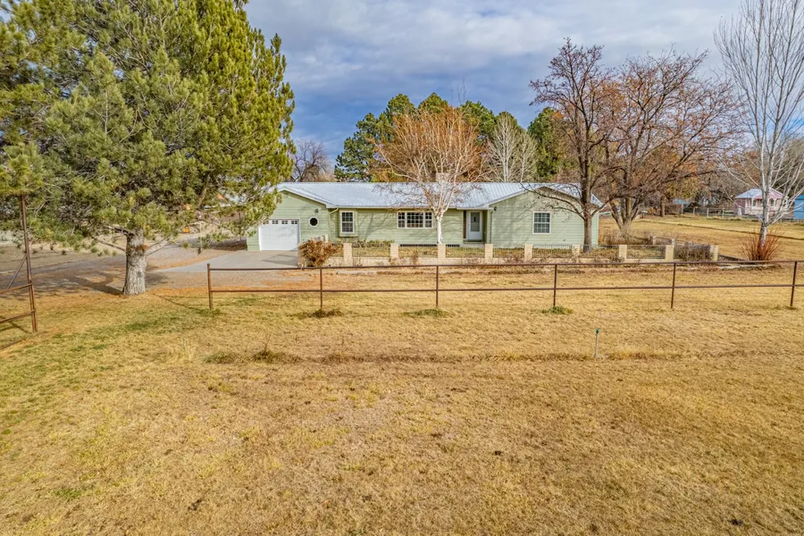 Country Style 4 bedroom, 3 bath home on 1.88 irrigated (per seller) acres wrapped with piped fence and beautiful shade trees. With two primary suites, a cozy living area with a gas fireplace and newer carpet. The kitchen offers solid wood cabinetry with tons of storage and beautiful solid surface countertops, a large island and SS appliances. There is a large laundry/mudroom just off the one car attached garage. Enjoy the covered patio to relax or entertain. You will love all the room for horses or other animals, with a hay barn and fence line feeders. There is a 28x36 finished garage/shop, with covered RV parking and 220 amp outlet. This property is also on natural gas.