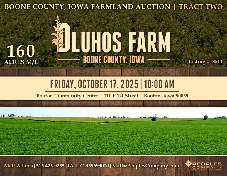 Boone County, Iowa Farmland Auction - Mark your calendar for Friday, October 17th, 2025, at 10 AM! Peoples Company is pleased to be representing the beneficiaries of the Margaret A. Dluhos Revocable Trust in the sale of their family farm located northwest of Woodward, Iowa, and northeast of Bouton, Iowa. The portfolio consists of 235.60 acres m/l and will be offered as two individual tracts. The tracts are located in Sections 26 & 27 of Peoples Township, Boone County, Iowa.