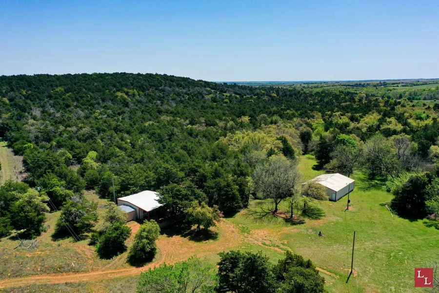Located on an island of timber in an ocean of farmland, The Ranch on Sugar Creek is 160 +/- acres of prime hunting land in Caddo County, Oklahoma. The property is a short drive from the Oklahoma City metro area and is unique in terms of its accessibility and water features. The property lies one mile down a dead-end road just southwest of Hinton, Oklahoma. Sugar Creek is spring-fed and runs year-round. It flows for over half of a mile through the property and the headwater spring is a short distance to the north. The creek fills multiple ponds in the area as it travels toward the Washita River in the southern part of the county. The property boasts a quaint 30 x 30 two-bedroom hunting cabin with a 10 x 30 covered porch that overlooks the pond and bottomland. Just up the hill from the cabin is a 30 x 50 insulated metal shop complete with electric and a concrete floor. About 50 yards from the cabin is a metal horse barn also wired with electric. The horse barn could easily be converted into another shop or covered storage for equipment.