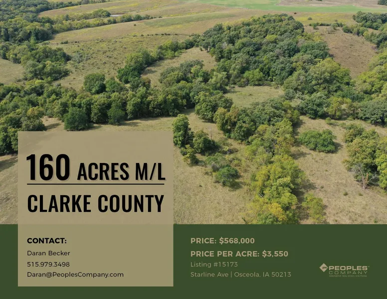 Peoples Company is pleased to present 160 acres m/l of open pasture located on pavement (Starline Ave) and just 1/2 mile North of Hwy 69 in Clarke County Iowa. It's hard to find good pasture, on pavement, with good fence and rural water already on site. If you are looking to build, the views are amazing and there are plenty of sites for a large pond to be built. There is a wooded draw that runs through the middle of the farm and it is a natural travel corridor for whitetail deer headed to the crop ground across the South fence. The fences are in good shape and the pasture has been well taken care of. Roughly 87.6 acres are considered FSA tillable but the whole farm is currently in pasture.
