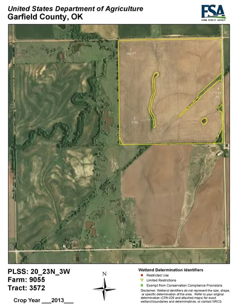 Farm #1: 160 +/- acres 1 miles N. of Garber to Carrier Rd., then 2 miles E. According to the Garfield Co. F.S.A., there are 151.13 acres of cropland with a 149.7 acre wheat base and 34 bushel/ acre yield. Principle soil type of the cropland is Kirkland-Renfrow complex, Class III with lesser amounts of Kirkland silt loam, Class II and Renthin-Masham complex, Class III. The balance of the land is in scattered timber. Legal: The NE/4 of 20-23-3W, Garfield Co., OK. Minerals: do not sell. Crop: does not sell. Possession: is to be given upon payment in full of the purchase price and transfer of title. '12 Taxes: approx. $573.00. The 2013 taxes will be prorated to the day of closing. Terms: 10% down the day of auction with the balance due on delivery of merchantable title. Announcements made day of auction take precedence. Call auction managers, Quentin & Lynsie Sturgeon at 580-554-7133/ 554-2633 for more info.