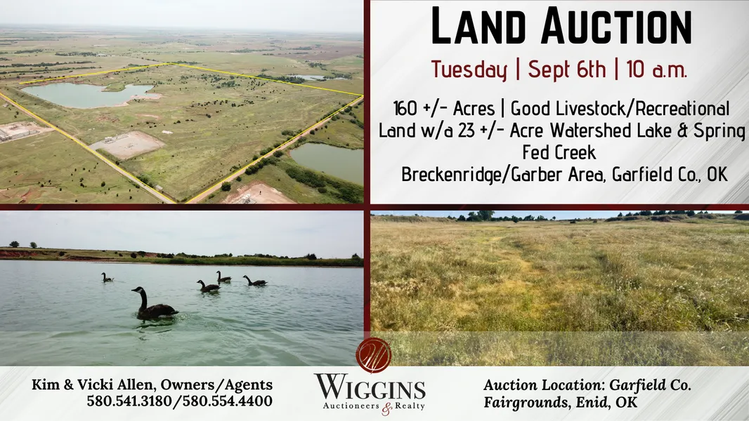 160 +/- Acres | Good Livestock/Recreational Land w/a 23 +/- Acre Watershed Lake & Spring Fed Creek | Breckenridge/Garber Area, Garfield Co., OK