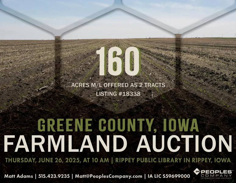 Mark your calendar for Thursday, June 26th, 2025, at 10 AM! Peoples Company is pleased to be representing Patricia I. Anderson Estate in the sale of their family farm, located just east of Rippey, Iowa, and northwest of Perry, Iowa. The farm consists of 160 acres m/l and will be offered as two individual 80-acre tracts. The tracts have great access off paved County Highway E57/290th Street and X Avenue, offering easy access to surrounding grain markets. These nearly 100% tillable tracts have an average CSR2 soil rating of 86.2, well above the Greene County average CSR2 soil rating of 78.3. The primary soil types include top-producing loam soils of Canisteo, Clarion, Webster, and Nicollet. The cropland acres are Non-Highly Erodible Land (NHEL), and a wetland determination was completed in 2016 that designated the farmland as Prior Converted/Non-Wetland. These tracts are located in Section 12 of Washington Township, Greene County, Iowa.