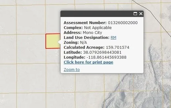The prort is 160 rs of raw lnd located at th bak of Mono Lake. Property has great views of the valley and surrounding mountains. Wild horses are regularly seen in the area. A home will required an extensive road that supports to CAL FIRE code. Road will have to be coordinated with BLM from Dobbie Meadows Road. Property is challenging to get to and will require hiking (1/2 mile from faint road), but if you like high desert location and the surrounding mountains, this is a very unique and beautiful property. Survey has been completed by Eastern Sierra Survey. Eastern Sierra Survey can walk the property with a buyer and Identify 3 of the 4 corners. Zoned RM-Resource Management