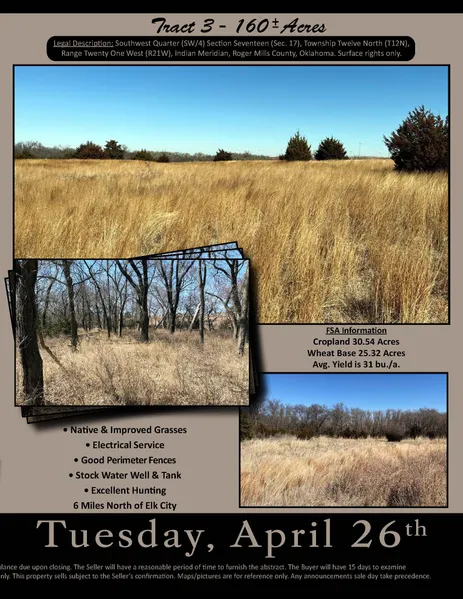 Real Estate Terms & Conditions: 10% of the purchase price of the real estate will be deposited in escrow the day of sale with the balance due upon closing. The Seller will have a reasonable period of time to furnish the abstract. The Buyer will have 15 days to examine the abstract and closing will be within 5 days of acceptance of title. Possession following 2022 wheat harvest or graze out. Selling surface only. This property sells subject to the Sellers confirmation. Maps/pictures are for reference only. Any announcements sale day take precedence.
