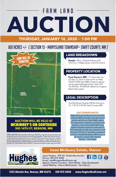 Details: 160 (+-) Deeded Acres with 154.75 (+-) Tillable Acres. Soil CPI of 64.2. The Northeast Quarter (NE) of Section 15, T-121-N, R-41-W, Swift County, MN
