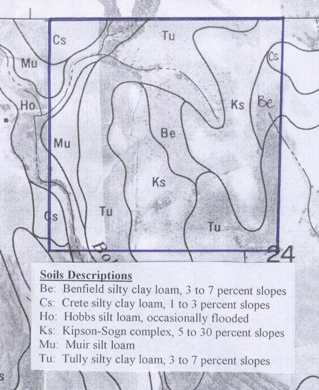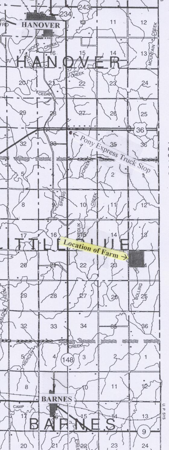 This farm is located 4 miles south on K-148 from the US-36 and K-148 junction (Pony Express Service Center), or 5 miles north of Barnes on K-148 to the corner of All American Road (K-148) and 15th Road, then 2 miles east. This is the northwest corner of the farm, at the intersection of 15th Road and Cross Creek Road.