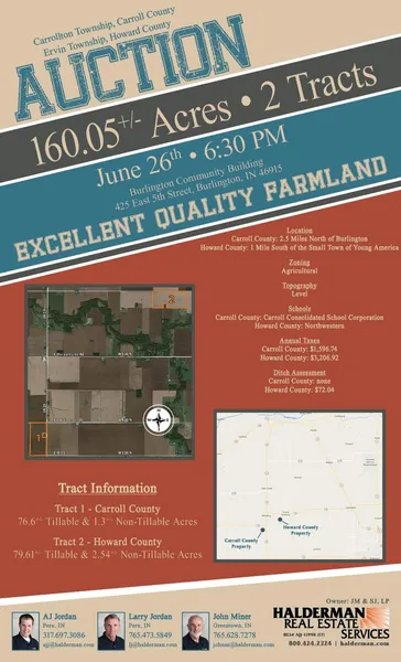 Legal Description: Located in a part of the East half of the NE 1/4 of Section 15, Township 24 North, Range 1 East, Carroll County; A part of the NE 1/4 of the NE 1/4 pf Section 1, Township 24 North, Range 1 East; A part of the North 1/2 of the NW 1/4 of Section 6, Township 24 North, Range 2 East; Howard County. Carroll County Parcel #08-09-15-000-006.000-004 and Howard County Parcel #'s 34-01-01-200-003.000-018, 34-02-06-100-001.000-018, 34-02-06-100-002.000-018
