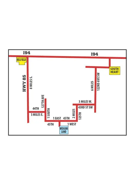 Research Parcel InformationLAND LOCATION: FROM BELFIELD, ND: 7.5 MI. S. ON HWY 85, 3 MI. E. ON 44TH ST SW., 1 MI. S ON 127TH AVE, 1 MI. E. ON 45TH ST SW AND 0.5 MI. S