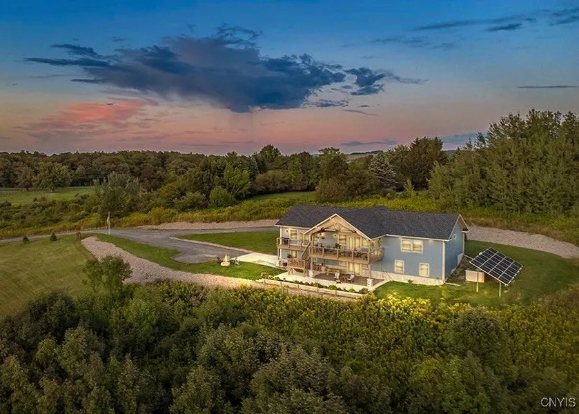 Perched above it all on 4.56 acres in the serene countryside of Tully, New York, 1600 Ripley Rd is an extraordinary three-year-old custom ranch, meticulously designed to harmonize with its breathtaking surroundings. Positioned to capture vibrant sunsets, vistas of Otisco Lake and the gorgeous countryside, this property blends natural beauty with architectural excellence and the finest in construction materials. The main level features a magnificent great room with 16-foot post-and-beam maple vaulted ceilings, hickory hardwood floors, and a stone fireplace. A striking window wall with sliding doors opens to an expansive deck, framing the scenic landscape. The gourmet kitchen boasts custom hickory cabinetry, quartz countertops, a refined tile backsplash, GE Monogram appliances with dual ovens, a farm-style sink, and an island with a butcher block top seating four, complemented by a pantry with stained glass doors. The dining area, with its own window wall, seamlessly connects to the kitchen and shares the views. The primary suite offers a luxurious bathroom with dual sinks, a walk-in shower, walk in closet, and laundry room. An office and half bath round out the main level. The walk-out lower level includes a den with a wet bar, three bedrooms, a full bath, and a covered stamped concrete patio beneath the deck, providing additional views. A 1.5-car attached garage with epoxy flooring and a dog wash station adds functionality. The 56x40 detached garage has power and water and a 1,200 sq ft unfinished loft, offering endless customization possibilities. Highlights-whole-home generator, 30-year architectural roof, 400-series Anderson windows, 46kW RaVolt solar panels, Ruud dual zone HVAC, Navien tankless hot water heater, Hardie cement fiber siding, and spray foam insulation. Due to being on solar, the home being so energy efficient, and taxes being low- 1600 Ripley offers affordable living for a home of its caliber. Located minutes from Beak and Skiff, Otisco and Skaneateles Lakes, yet under 30 minutes from Syracuse, 1600 Ripley Rd offers rural tranquility in a spectacular setting while still being close to amenities. Open House- 9/28 12pm-2pm.