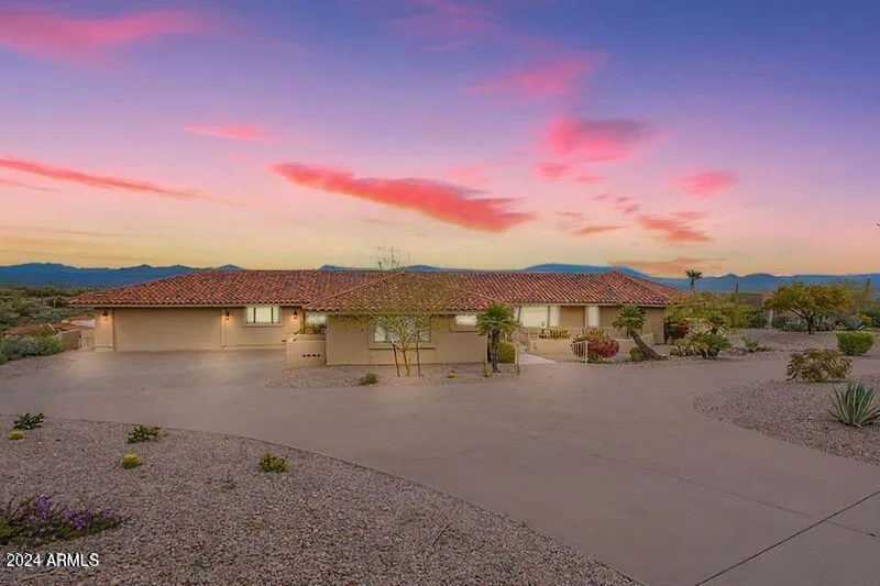UNOBSTRUCTED VIEWS of FOUR PEAKS! This charming Single Level home has so many Great Benefits; all on one level, split floor plan, 3.5 baths, vaulted wood beam ceilings and a Fantastic guest or in-law suite. The Floor-to-Ceiling windows along the back of the home showcase the Beauty of the Mountains and our Famous Fountain. Guests will be enraptured by the ever-changing skies as they walk around the home. All 3 bdrms are split for privacy; the owner's suite has multiple closets w/ a sliding door to the back patio; there's a spacious en-suite bath with a free-standing jetted tub, 2 separate vanities w/ Quarts counters, a tile shower and don't miss the small Zen patio which is perfect for enjoying morning coffee/tea. The Kitchen has New Quartzite counters, New appliances and a Breakfast bar. The Guest bedroom and a 3/4 bath have access to the back patio & the pool. The Guest Casita is a full Suite and it's accessible from the main house; it's very private with a small family room, kitchenette and a separate bedroom and bath. This suite has a sliding glass door to the front courtyard as well as a single Glass French door near the kitchenette leading to a private patio and side yard. What a wonderful property for someone living with an adult child, elderly parent(s) or lots of guests that come to visit. The home is on over an acre and has a beautiful, wide turn-around-driveway and a side entry, extended-length garage. The view from the garage window is picture perfect.
