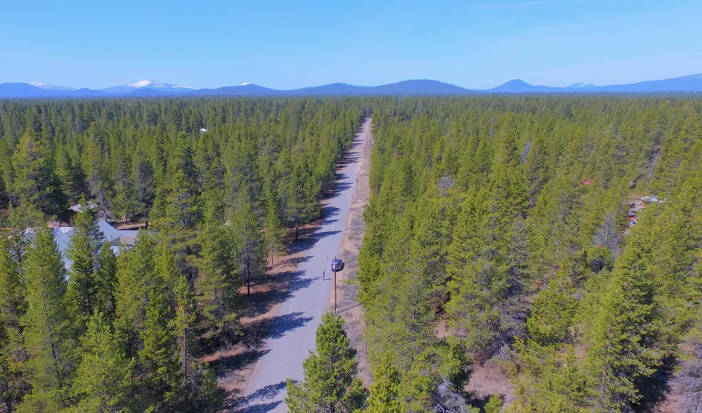 This has power lines at the road, flat terrain, gravel road access, and just a stunning landscape with mature conifers everywhere.