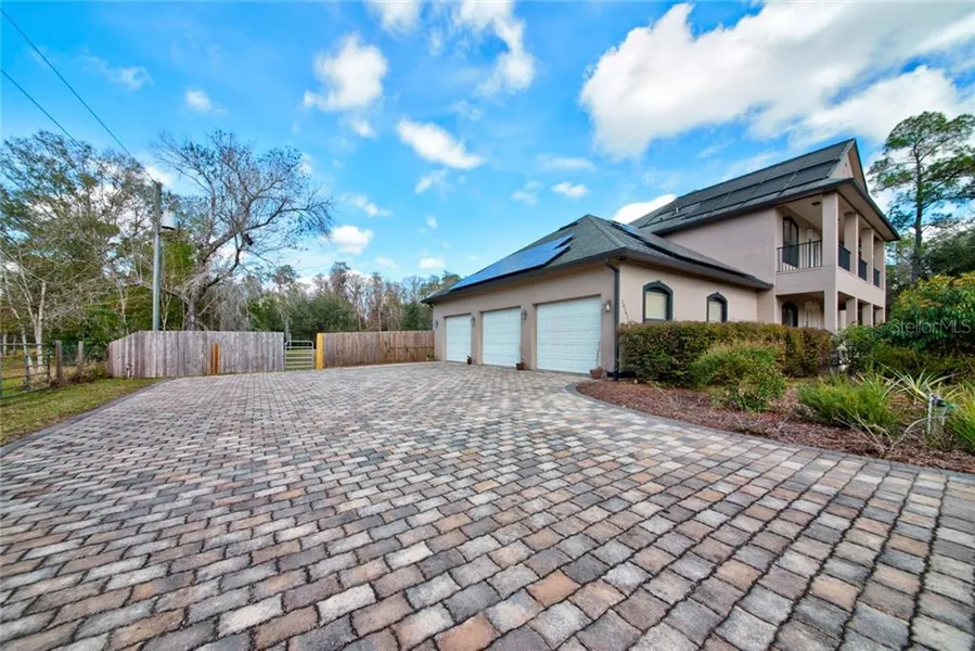 One or more photo(s) has been virtually staged. Beautiful custom-built, energy efficient, one-of-a-kind home, on almost 3 acres conservation lot that is high and dry with mature landscaping. Home features 6 bedrooms, 5 1/2 baths with a bonus room under 4836 square feet with NO HOA. Quiet country living at its best within minutes of all amenities. You will be amazed when you come through the privately gated home with long circular, paver driveway, manicured lawn, front & rear covered porches. Oversized 3 car side entry garage and extra-large driveway offers plenty of parking. Enter the stunning 2 story foyer that accesses the formal dining room and living room. Gorgeous, engineered wood floors throughout the first floor. There is a bedroom downstairs with a hidden room behind a bookcase. Huge game/bonus room with wet bar and a full bathroom overlooks the pool area with loads of windows. Another full bathroom by the kitchen which also has access to the pool. Enjoy cooking in state-of-the-art designer kitchen w/ custom solid wood cabinetry, granite counter tops, stainless steel appliances, double oven with warming tray, under cabinet lighting. Reverse osmosis system, Island and Walk-in pantry. Huge Family Room w/ fireplace and built-in bookcases. The Outdoor Living space is True Florida Paradise! Enjoy and Relax on your Lanai overlooking the sparkling solar heated saltwater Pool and Spa. Perfect for morning coffee in this peaceful, quiet location. Enjoy views of deer, turtles, hawks, chirping birds and more. The second-floor landing features a loft overlooking the foyer. Upstairs the generous master suite has dual sinks, Jacuzzi tub & separate standing, walk-in shower, and Huge walk-in closet in Master bedroom. 2nd story relaxing balcony space to enjoy quiet evenings. Upstairs laundry room with sink has an abundance of space. The 3rd, 4th, 5th bedroom and 4 full baths are located upstairs. 2 bedrooms are en-suite bathrooms. All bedrooms are generously sized w/ plenty of storage & closet space. The home is equipped with whole house owned SOLAR SYSTEM and Energy Efficient AC with a NEST Thermostat, propane, and security cameras. Have a love for plants? Enjoy plenty of space for gardening. The property has been turned into a gardener's paradise with apple trees, avocados, bananas, star fruit, jaboticaba, loquats, orange, mangoes, peaches, plums, and pomegranate. There is also Blue Basil, Barbados Cherries, Blackberries, Rosemary, and vegetable garden beds. Custom-built chicken coop. Did I say NO HOA!!! Bring your pets and store your boats and RV on property and see the potential this home has for your family. Unincorporated save on taxes. Newer Hybrid Hot Water Tank. Convenient to Shopping, Restaurants, freeways and a short drive to Downtown Orlando and the Space Center. This property has so EVERYTHING you could possibly want. See this gorgeous home TODAY before it is gone. Additional parcel for sale next to this listing. Will sell together or separate. Check out the 3D virtual tour and call us today for a private showing.