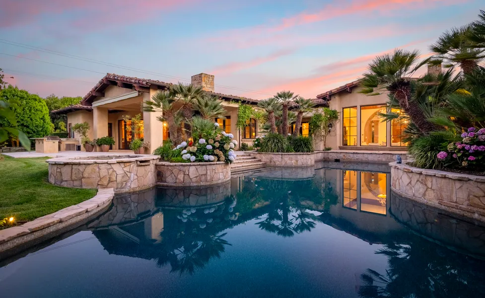 Welcome to an exclusive equestrian estate in the prestigious Rancho Santa Fe Covenant, where luxury meets elegance in a custom single-level residence. The captivating entry opens to a formal living and dining room, both overlooking 3.72 acres of beautifully landscaped grounds, including a resort-style pool with a water feature and elevated spa. This home showcases impeccable craftsmanship throughout, with hardwood floors, soaring coffered ceilings, and elegant wood paneling. The main house features four ensuite bedrooms and a serene master retreat, complete with a fireplace, a claw-footed tub, a spacious glass-enclosed shower, and a grand custom walk-in closet. The gourmet chef's kitchen is outfitted with top-tier Viking and SubZero appliances, a copper sink, a Miele espresso machine, and a custom stone exhaust hood. Boasting a 1,000-bottle temperature-controlled wine room, a billiards room with a custom bar, an executive home office/library, and a family room with a hidden movie screen. French doors lead to a fully fenced backyard with a built-in BBQ, outdoor kitchen, pool/spa, bocce ball court, and multiple seating areas. Additional highlights include a one-bedroom, one-bath detached guest house. The property also includes a four-car garage, a citrus orchard, solar panels, and a reverse osmosis water system. Equestrian enthusiasts will appreciate the world-class stables with three oversized padded stalls, a spacious tack room, and a full-sized mirrored dressage court with premier footing.