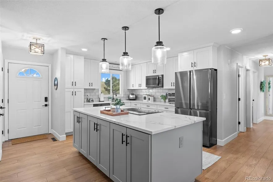 Welcome to this 10.32 acre horse property with canyon views. This remodeled farmhouse-style home has a desirable open floor plan with plenty of room to entertain. You can enjoy the incredible views from every window. In addition to the living room, dining, and kitchen, the main level consists of the primary suite & 3/4 bath plus 2 additional bedrooms and a full bathroom. Downstairs, the walk-out level includes a family room, laundry, bedroom, bonus room, and office or additional nonconforming bedroom. The home features new paint inside and out, a new high-impact roof, new flooring, new kitchen cabinets, quartz counters, and tile backsplash. You will enjoy fantastic sunsets on the back deck with a fenced backyard. The outside facilities are turn-key for those who have animals. Who wouldn't enjoy heading out to the chicken coop in the morning to collect eggs? The coop can be used for chickens or a greenhouse. The 42 x 54 metal building with concrete floor can be matted and used for horses, workshop or additional garage space. There are 3 loafing sheds with their own fenced areas (4 stall loafing shed is cross-fenced for two paddock areas). Plenty of room to park all of your toys including trailers and/or RVs. Behind the metal building is an outdoor arena. Within the community, there is a 31-acre lot that you can ride your horses on. No active HOA! Located in the highly sought-after Castlewood Canyon, it is an easy drive to Castle Rock, Parker, Elizabeth, or Colorado Springs. Come in, take your boots off and get ready to call this property home. Call today for your private showing.