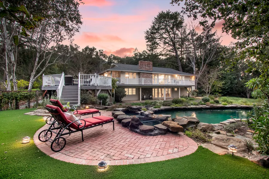 A beautiful location with tree top views and lovely grounds of over one acre! Private and serene, a spacious floorplan with generous primary suite and office on the main level, bonus room, three guest bedrooms and laundry room on lower level. Vaulted ceilings and walls of French doors showcase the expansive views. Inviting tiered deck is a perfect addition to enjoy indoor/outdoor living. Dine al-fresco overlooking the lovely pool area, well designed to integrate into the natural landscape. Beautiful waterfall cascades over river rocks. A chef's delight, custom cabinets and professional grade appliances are enjoyed in kitchen. Formal living room and dining room soak up sun lite interior. Large motor court and covered porch separates front entrance from over-sized three car garage. This excellent location is situated nicely between the Village of Saratoga and vibrant downtown Los Gatos and enjoys top Saratoga schools. A convenient location off Highway 9, enjoy the close proximity but peaceful, relaxing setting!