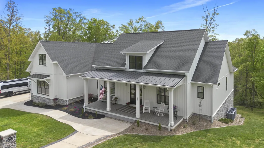 While many Realtors boast that a listing “has it all,” this stunning new home truly delivers. With 6363 sq. ft., this is definitely not a drive-by. It’s like having two homes in one! Situated on 2.16 wooded acres, this expansive 6-bedroom, 5.5-bath modern farmhouse offers numerous and thoughtfully designed rooms! Step onto the inviting 32-foot front porch and into a vaulted foyer that opens to a breathtaking two-story living room with a stone fireplace & gas logs. The open-concept layout continues into a covered porch and a gourmet kitchen with a Kitchen Aid appliance package with double ovens (to include European heating element/fan) and gas powered Viking cook top, quartz countertops, a spacious island, and a triple-stage, clearly filtered water system at the kitchen sink. Enjoy your morning coffee in the light-filled breakfast room with views of the woods, and store everything you need in the custom walk-in pantry with a coffee station to impress any coffee lover. The home flows into two distinct wings. One wing includes a mudroom with custom cabinetry, a half bath, and a laundry room connected directly to the main bedroom. The luxurious primary suite features a spa-like bath with dual vanities, a soaking tub, a walk-in shower, a separate vanity area, and a large custom walk-in closet. This wing also offers access to a two-car garage equipped with a Tesla charger, as well as an upstairs suite with a walk-in closet and full bath, currently used as a home office. The second wing on the main floor includes three additional bedrooms and two full baths, one of which is en suite. The lower level is designed for both entertaining and everyday comfort, featuring a second custom kitchen with a 12-seat bar, a game area, and a home theater outfitted with a $30,000 Sony 4K projector and Dolby Atmos 9.2 surround sound. This level also opens to a second covered deck and includes a sixth bedroom with generous living space, a fifth full bathroom, and two versatile flex rooms—currently a home gym and multipurpose room, complete with built-in safes. Additional features include a whole-house generator, SOLAR POWER system with transferable SREC rights (ELIMINATING ELECTRIC BILLS), custom plantation shutters, $32,000 fully encapsulated crawl space for energy efficiency, a Rinnai continuous gas water heater, and a Vivint security system with four exterior cameras and window sensors. Internet which is fiber ready , $9,000 leaf filter system added to all gutters, and honey crisp apple trees planted from seeds! The home is climate-controlled by three Ameristar HVAC units and includes a 400 sq. ft. unfinished interior storage room—perfect for seasonal décor. Conveniently located just minutes from I-64, Ritter Park, and local amenities, this home offers the perfect blend of luxury, comfort, and practicality in a highly desirable subdivision.