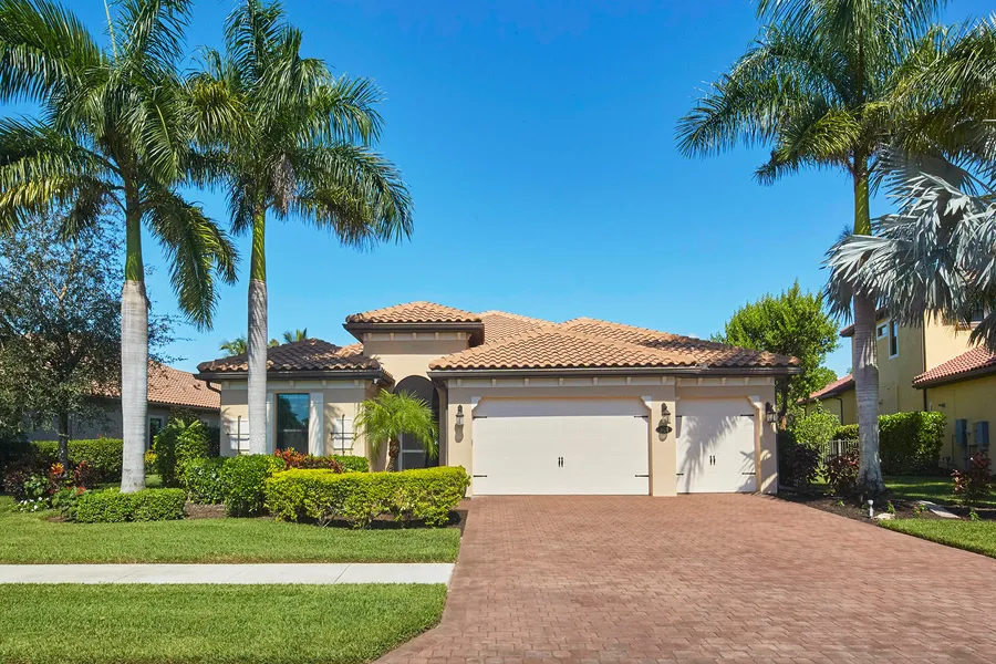 This 3BR + Den property is located on an exceptionally beautiful and private lakefront lot at the end of a quiet, well-landscaped cul-de-sac with no through traffic. The rear of this one-of-a-kind water and preserve location, without any houses in sight, provides gorgeous sunset colors and lots of wildlife. The split bedroom floor plan offers privacy for all, along with a conveniently placed den and 3 full baths. The large open kitchen, with a glass tile backsplash and a walk-in pantry, is open to the great room for easy, comfortable entertaining. The primary suite has private lanai access plus a large double window, dual walk-in closets, a separate tub and shower and dual sinks. The very spacious lanai features a large pool with a sun ledge, an elevated spa with custom tile, and also has a private exterior sunset viewing patio. Interior walls and front exterior are freshly painted. $50,000 Tesla rooftop solar panel system for low electric bills, including a power wall battery storage plus 30 amp electric car plug-in . Low-density, quiet, gated community with only 110 homes featuring large lots and low fees. Ready to move into, with quick closing available.