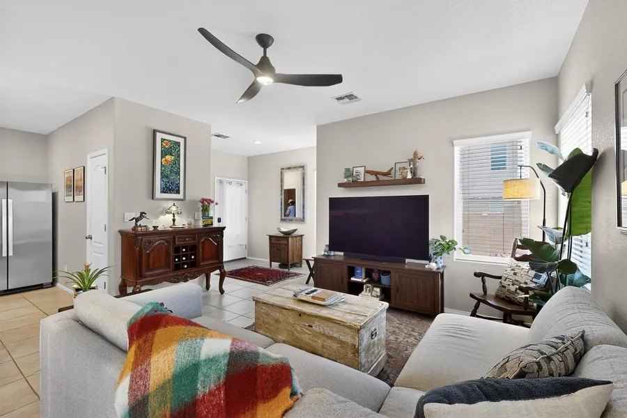 Move-in ready townhome shows like a model! Professional, low-maintenance landscaping w/ flower beds, drip system, turf, fire pit and seating, and solar lighting create a private outdoor oasis perfect for entertaining. Inside boasts granite counters, updated fixtures, SS appliances (all incl.), under-cabinet lighting, tile backsplash, & custom sink/vanity in the 1/2 bath. Smart home devices like MyQ, Yale, Ring, and Google Nest add convenience. Storage racks and shelving in garage and under stairs. Enjoy Sandia views from the LR! Upstairs offers a split floorplan w/ private primary suite featuring a large bath & walk-in closet. Each bedroom has upgraded custom closets. Laundry is stacked--W/D stay! You'll love this turnkey home. Near KAFB & Sandia Labs. Note: Occupancy available on 9-18-2025.