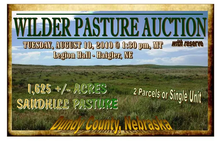 The Wilder Pasture Land for Sale is located 15 miles North of Haigler, NE, in Dundy County NE. The 1,625 +/- acres Ranch Land for Sale to be offered in 2 Parcels and as a Single Unit. The multi parcel bidding format for the Wilder Pasture Land Auction facilitates multiple Buying opportunities. Parcel #1 consists of 659 +/- acres pasture, Parcel #2 consists of 966 +/- acres of pasture, and the Single Unit consist of 1,625 +/- acres. The Wilder Ranch Land in Nebraska for Sale has not been grazed for the past 2 years and the grasses are in excellent condition with county road access. To take advantage of this opportunity to buy a Cattle Ranch for Sale in Nebraska, Sandhill Pasture Land for Sale, Southwest Nebraska Ranch Land For Sale, or Sandhill Ranch for Sale, consider the Ranch Land for Sale at the Wilder Pasture Land Auction. For further information click on the color brochure or click on the Virtual Tour for viewing of the Ranch Land in Nebraska for Sale.