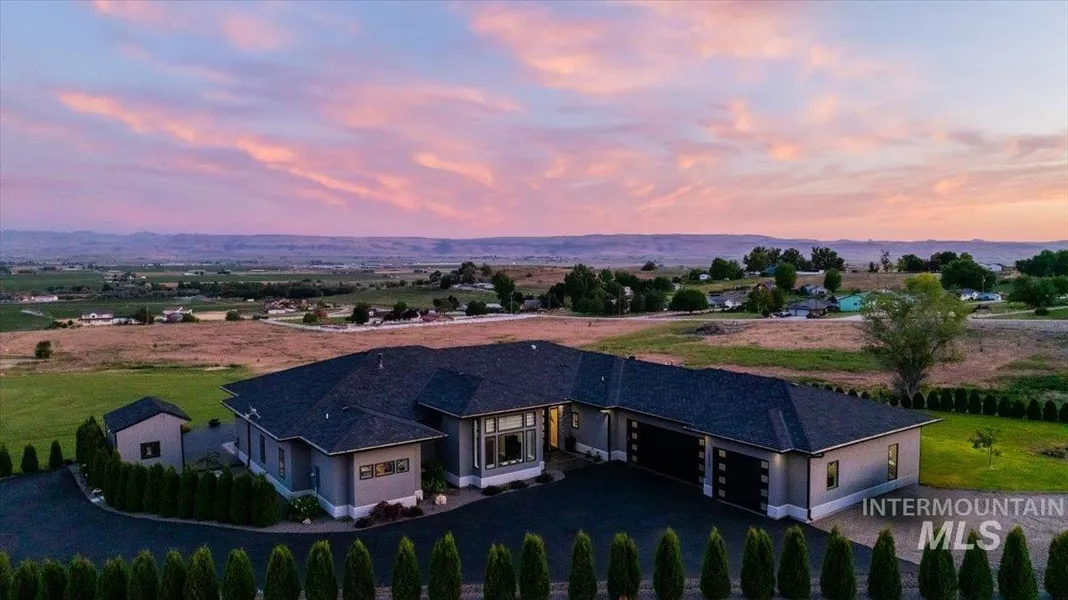 Unrivaled 4.49-acre single level estate with commanding Snake River & mountain views! This modern retreat offers seamless indoor/outdoor living with a spectacular patio that includes a sunken swim spa, luxe detached bar w/ half bath, dramatic fire features & color-changing lighting—perfect for unforgettable entertaining. Inside, the chef’s kitchen stuns with Thermador appliances, live-edge granite tops & mango wood bar, custom acrylic cabinetry, illuminated wine wall & walk-in pantry. Rich real hardwood floors flow throughout. Two primary suites offer spa-inspired sanctuaries with full-slab granite showers, soaking tubs, backlit accents & private patio access. Every bedroom enjoys stunning views. Great room features a retractable theatre screen & Atmos System, floor-to-ceiling Granite fireplace wall & vanishing pocket sliders revealing panoramic vistas. Additional highlights: 1800sf heated detached shop w/ 16’ doors & half bath, triple-zoned HVAC & more! Experience luxury, privacy & Idaho living at its finest