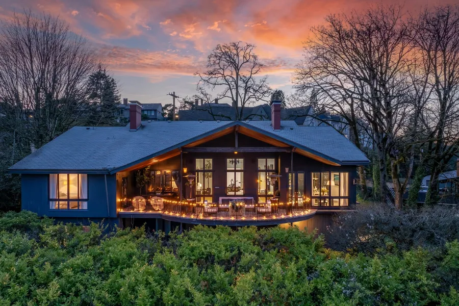 VIEWS! CONDO ALTERNATIVE! Poised above the city at the foot of the West Hills, this singular 1961 residence in Portland Heights commands rare panoramic views of Mount Hood and the downtown skyline. A dramatic renovation has preserved the home's authentic mid-century modern architecture while introducing high-end finishes and modern amenities. A striking entry with a Chihuly-inspired custom skylight installation sets the tone for the home's artful design. The main living spaces unfold primarily on one level, where floor-to-ceiling windows frame sweeping city vistas from nearly every room. 14-foot ceilings, pale chevron wood floors, and a wood burning fireplace in the great room evoke the elegance of a Paris apartment, while an adjacent den with a second fireplace provides the perfect setting for a nightcap. The kitchen is sleek and stylish, with black leathered granite countertops, an oversized island with prep sink, and premium appliances, including a full-height Sub-Zero wine refrigerator. A sun-drenched breakfast nook opens onto the home's most distinctive feature - a stunning curved balcony with a firepit and breathtaking views of the mountains, river, and city, including the future South Waterfront MLB ballpark. The luxurious primary suite offers balcony access, distinctive porcelain tile flooring and accents, a freestanding soaking tub, and a spacious shower with rain showerhead. The expansive lower level, complete with a fireplace, serves as a blank canvas with flexible spaces ideal for guest quarters, media space, fitness area, game room, or storage. A compelling alternative to luxury condo living, the home is set on nearly half an acre at downtown's western edge, with a low-maintenance yard. Off-street parking accommodates over eight vehicles, with covered parking for three. The property enjoys an enviable location between Washington Park and the city - minutes from Multnomah Athletic Club and downtown - a perfect blend of natural serenity and urban convenience.