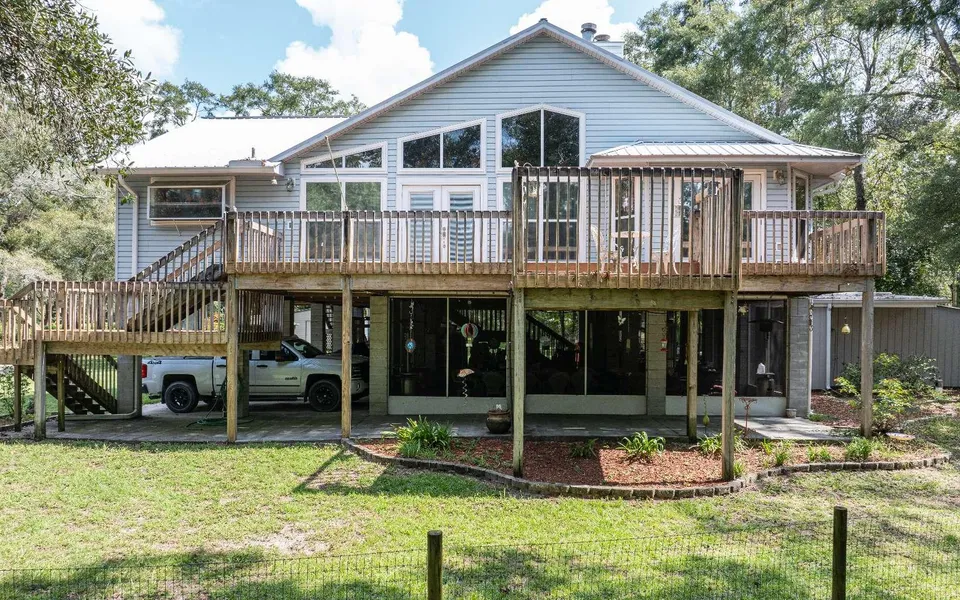 Custom-built river home with a spring! 2,300sf, 4/2 home on just over 3 acres. This unique property offers approx. 400 feet on the Suwannee River, with a floating dock and a freshwater spring at the river's edge. This property was designed for comfort and entertainment. The home has high ceilings, lots of natural light, and views of the river. Some of the amenities are a gorgeous fenced-in yard, multiple outbuildings, covered parking, and ample storage under the home. The downstairs screened room has ceiling fans and a quarter bath. Custom firepit with seating and homemade roaster, the back deck has space for a hot tub, the front porch has a lift, tankless HWH, and a whole house generator, not to mention the full RV hookup with a separate septic system and so much more! Witness the beauty of this property photos taken just two weeks after Hurricane Debby shows the river at high levels and the road passable, demonstrating its resilience and allure. Reach out to your Realtor for a comprehensive feature list. Included is a floor plan and 3D Tour. Call for an appoitment today!