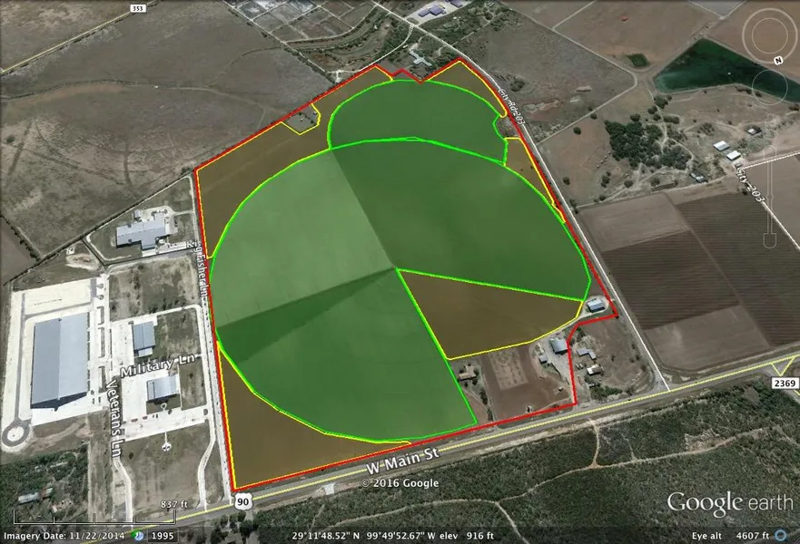 The Kirk farm fronts on Highway 90 on the west side of Uvalde, and contains 164.4468 acres: 117 acres irrigated by pivot (one ~95 acre pivot and one ~22 acre pivot) and 37 acres of furrow irrigation. There are two irrigation wells on the property. The first well is an Edwards well located near Highway 90 on the north end of the property. A total of 143.920 acre feet is authorized to be withdrawn from this well per annum: 77.143 acre feet is considered Edwards base water and 66.77 acre feet is Austin Chalk. The other irrigation well is designated Austin Chalk and is permitted to pump an additional 159 acre feet. This totals 302+ acre feet permitted.