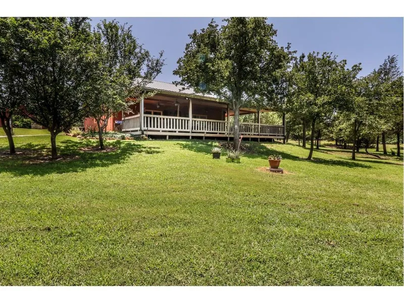 Perfect country retreat with elegant rustic appeal on 10+ acres adjoining LBJ Grasslands. Home features steel frame construction & metal roof. Huge porch the length of the home overlooks the pond & is perfect for watching the wildlife. Red barn is 30x40 with a 12x30 overhang. Artistic details in this home...doors from a 17th Century Monastery in Mexico, hand carved cabinets by Mexican artist, claw foot tub and many more details you have to see.