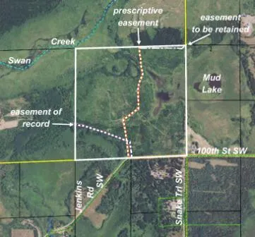 Subject to 100th St SW and Jenkins Rd SW. Subject to county prescriptive easement. Subject to easement of record through SWSE. Easement will be retained over prescriptive easement trail and existing trail near north line to provide access to SWNW, 4-134-32. Photos and maps are for convenience only and are not guaranteed; tree cover may be different than depicted. Physically inspect the property prior to purchase. Not surveyed nor corners marked; dimensions approximate. If deer stands are located on this tract, they are not the property of Seller and are not included in the sale. Use seller-approved purchase agreement & addendum; closing dates the 2nd Wednesday of each month.