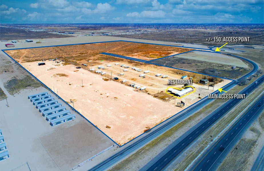 An ideal spot for development as the need for buildings west of Odessa towards Pecos continues to grow! This 76.77 Acre property is a large RV/trailer park with a restaurant situated on I-20 Service Rd. Many spaces are vacant and ready for occupancy. It has 3 water wells and makes plenty of water, which is unique for this area. The site has Wi-Fi and each space is not metered. Owner can rent spaces based on 30- or 50-amp power. There are 33 spaces with 50-amp Service and 63 spaces with 30-amp service. There are pay laundry facilities on site as well. The 1,363 SF restaurant is in good shape for business. There is a +/-150' wide access road at the narrow point near FM 866 and I-20 - this is a legal access point for anyone interested in developing this land.