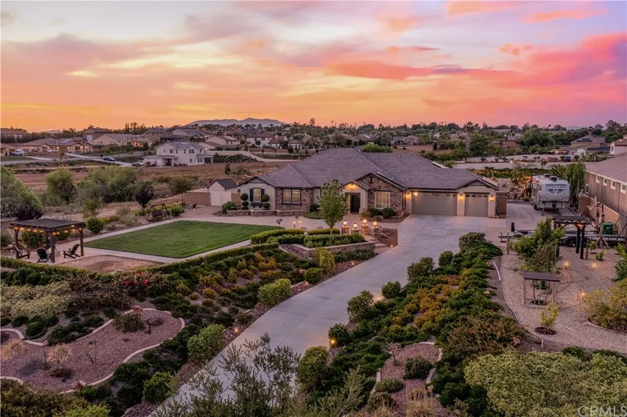 This highly sought-after home sits atop a 1 acre fenced lot in the luxurious Estate Collection at Woodcrest. The craftsmanship of this exquisite home is seen in the intricate details throughout. As you enter the foyer, you'll notice the spacious dining room and butler pantry, which leads to the kitchen and great room with stunning beamed ceilings and custom fireplace. There is an abundance of natural light that compliments the open floor plan. Plantation shutters and recessed lighting accentuates this wonderful space. It is an entertainer's dream with a gourmet kitchen featuring stunning granite counters, a huge island, stainless steel appliances with double ovens, chef's grade cooktop, and custom cabinetry with brushed nickel hardware. The breakfast nook overlooks an amazing backyard which features a custom designed resort style pool and spa, with a 360-degree waterfall, slide, grotto, two Baja shelves and a fire pit. An impressive hardscape design accentuates the pool with custom pavers surrounded by low maintenance flower beds, a huge covered patio and two seating areas for relaxing on the deck by the pool or Koi Pond. The outdoor kitchen and fireplace have been prepped and the architectural plans will be left with the home. There is a home office with a full bathroom adjacent that can be used as a guest room. The owner's suite exudes comfort and luxury with an ensuite bathroom featuring a vanity with dual sinks, separate tub and shower and oversized closets. All three additional bedrooms are spacious with custom colors and ceiling fans. Additional features include dual A/C, tankless water heater, oversized 46 panel owned solar system with upgraded 400-amp electric panel, Smart Home technology for thermostat, pool, yard lighting and commercial grade drip irrigation system controlled by your phone. So many more details including RV parking with hook ups, lush landscaped grounds fully fenced with electronic gate, and mini orchard with a variety of fruit trees and grapes. This home has been crafted with attention to detail and privacy. Located near major shopping, entertainment and all Riverside has to offer.