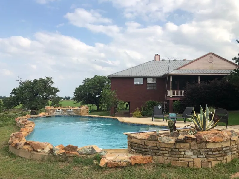 This beautiful 5/3 custom built brick home on 85 +/- acres near Pontotoc in Mason county is perfect for a large family and has everything needed for horses and livestock to thrive. The two story home with covered porches sits on a hill overlooking the land and is surrounded by large, mature live oaks. There are plenty of windows to let the natural light in and allow awesome views from every room in the house. The living/dining area has a fireplace with built-ins for books, pictures, and family treasures on each side. A great view of the pool area and back yard can be enjoyed from the dining area and kitchen. The spacious master suite has a cozy fireplace to enjoy on cold winter nights and an outside door allowing access to one balcony. Just off the master bedroom a bonus room can be utilized as a reading room, sitting room, or plant room. The master bath has a garden tub and oversized shower along with great cabinet space. In addition to the master suite there are two additional bedrooms and a shared bath between them on this level of the home. On another level there are two more bedrooms, a bathroom, and storage area. Flooring in the home is wood and tile. Each room has had unique touches added in paint, lighting, wood ceilings, and fans. The home is spacious with great flow for entertaining yet maintains a coziness and warmth throughout. A beautiful in ground pool with rock patio and outdoor fireplace offer the ideal place for outdoor enjoyment.