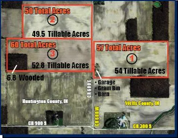 LOCATION: Tract 1 is located on the east side of CR 600 E, north of CR 300 S in Liberty Township, Wells County, Indiana. Tracts 2 and 3 are located on the west side of CR 600 E, north of CR 900 S in Salamonie Township, Huntington County, Indiana.
