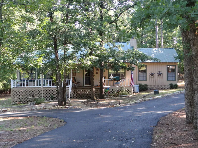 Fantastic 3BD-2BA home nestled on 5 wooded lots (one fee) with tons of upgrades! Open concept living/dining/kitchen with living room featuring wood floors, vaulted ceiling and vent free, remote control gas fireplace. Attractive kitchen has granite countertops, under counter sink and custom pantry. Spacious master bedroom en suite has beautiful tile shower and double lavatories. Lots of windows infuse the home with natural light. Outside amenities include metal roof, expansive covered front porch, paved circular driveway, detached 2 car garage with floored storage in attic plus golf cart storage. Washer/dryer remain. This wonderful home in this perfect setting won't last long! - - -
