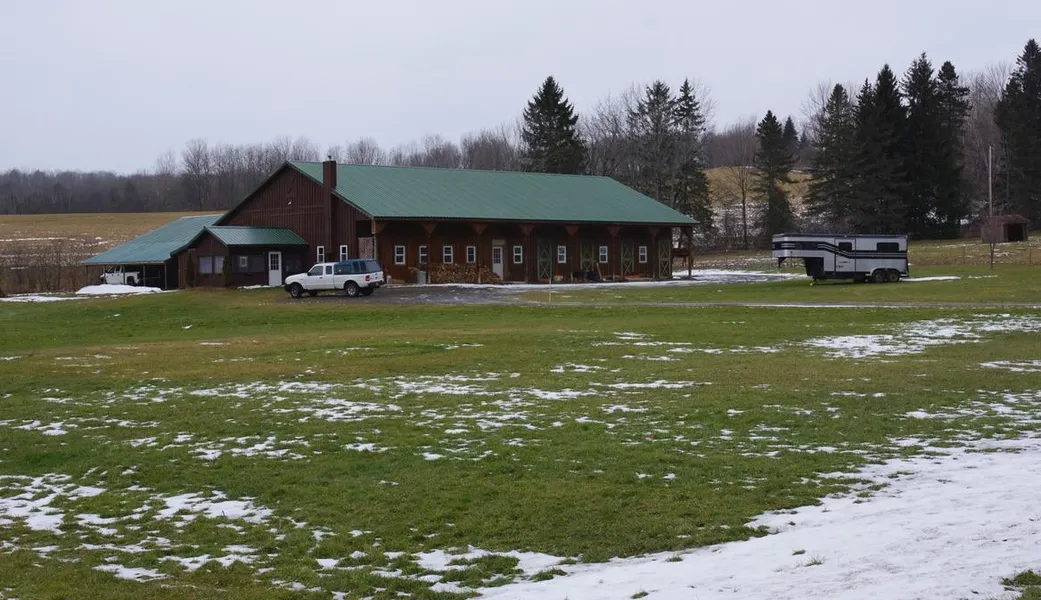 A barndominium! Well-kept, too. All buildings are new since 2000. The main structure is 72x84, has 6 box stalls, a 1000ft2 residence, and room enough left over for a small arena. Some of that space is used now as a farm shop. If you wanted more living space, some modifications to the roof trusses could nearly double the living space or you could expand into the rest of the barn. As it stands now, there is a kitchen/dining area, a large summer room, a living room, a professional office (which might be a bedroom for someone else), a study, and 2 more bedrooms plus the bath. Water is from a 200 drilled well and there is a 1200gallon septic. Heat is electric baseboard, but they prefer to use a wood stove and a propane backup. Walls are real wood paneling and floors carpet or laminate. Very comfortable, efficient, and theres zero commute.