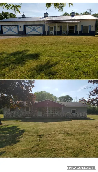 NEED TWO HOMES this is the property for you!! THis 5.7 acre property feature two home on one parcel. The ranch style home features 3 bedroom 2.5 bath with recreation with wet bar. Pole barn style home features living quarters including 2 bedrooms an office space and 2 baths. Attached to the living quarters is a 40x80 4 car garage with sliding doors leading out the amazing picturesque backyard. The 4 car garage features a garage door opener, heat, and industrial ceiling fans.