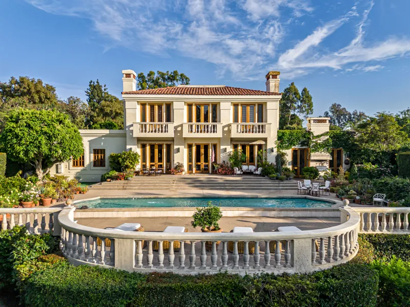 Introducing ‘Villa de las Mariposas’—The Rodriguez Estate Fairbanks Ranch, Rancho Santa Fe, CA Nestled in the prestigious Fairbanks Ranch community of Rancho Santa Fe, the esteemed ‘Villa de las Mariposas’ was meticulously crafted in 1984 and has remained under the care of its original owners. This solar-powered estate spans over 5,000 square feet of luxurious living space, combining timeless elegance with modern convenience. The primary residence features spacious bedrooms and 4.5 beautifully appointed baths. The estate includes a charming casita, a complete living residence with an expansive open-plan design, soaring beamed ceilings, a full kitchen, and a private bath. A distinctive highlight of the property is the 360-degree turntable, ingeniously designed to orient vehicles as they exit the parkway and garage. Guests are welcomed by a grand colonnade entrance showcasing magnificent 13.6-foot carved doors, hand-crafted from rare mahogany. Beyond the impressive foyer, with its lofty 12-foot ceilings, lies a majestic double staircase that leads to the private quarters. The estate's lush, tiered gardens are a true sanctuary. They feature a butterfly habitat, a putting green, and bocce and shuffleboard courts. The sprawling patio, equipped with a gas barbecue, offers ample space for outdoor entertaining. The interiors are just as captivating, with an imposing pillar-lined entry that opens into the grand great room and adjacent dining area. A sophisticated bar area seamlessly transitions into a modern kitchen outfitted with new top-of-the-line appliances,