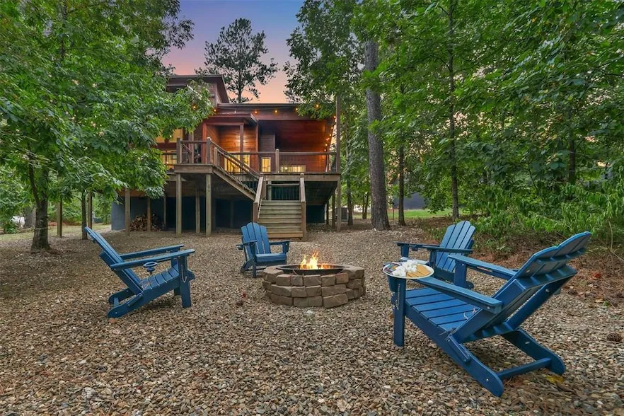 Welcome to Total Eclipse, a turn-key short-term rental that perfectly blends contemporary flair with cozy farmhouse charm. Nestled in the coveted Eagle Mountain subdivision off of a paved road and just minutes from Broken Bow Lake, Beavers Bend State Park, and favorite local hotspots, this one-bedroom, one-bath cabin is a dream escape. Step inside to discover 1,016 sq ft of thoughtfully designed space where rustic touches meet modern luxury. Soaring floor-to-ceiling windows flood the open-concept living area with natural light, highlighting a grand stone fireplace, custom cabinetry, granite countertops, a large kitchen island, and a shuffleboard table for a little friendly competition. The spacious king bedroom invites rest and relaxation with its warm wood accent wall, flat-screen TV, and direct access to the private covered deck. The spa-style en-suite bathroom is pure indulgence, featuring a soaking tub, a tiled walk-in shower with a luxury rainfall head, and elegant finishes throughout. Outdoors, unwind by the fireplace on the covered deck, soak in the hot tub under the stars, or gather around the fire pit. Whether you're looking for a peaceful retreat or a profitable investment in one of Hochatown s hottest neighborhoods, Total Eclipse is ready to impress.