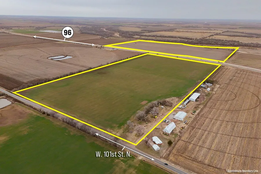 A property survey has not been conducted. Access is a drive off of W 101st St N, this drive appears to potentially be split by the property line and is shared with the neighboring property owner. There is no easement of record. The neighboring property owner also has their equipment and personal property located on the property in the approximate 2.5 acres that it not tillable farmland. This equipment and personal property will not be guaranteed to be moved off by closing and the new owner may have conversation with the neighbor on the matter.