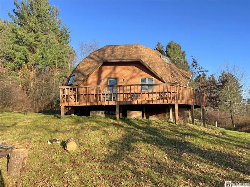 Unique octagonal dome home on a 1.3 acre lot in the town of Busti is now ready for a new owner! Open floor plan has great room, dining area and kitchen all open to the dome with two hexagonal skylights and a huge octagonal skylight. Front foyer also has a skylight and stained glass window...Back entry is from the two car attached garage. Sliders off the great room open to a wrap around deck and beautiful views of the countryside. There is a bonus room off the entry with another skylight, a first floor bedroom with door to the deck, full bath with separate tub & shower and a laundry room. Upstairs is an open loft area, another bedroom and a full bath. The full high dry walk-out basement has potential for more living space. With some updating, this could be your amazing country home!!
