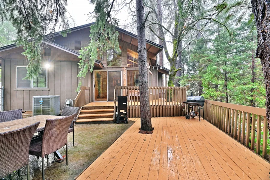 Spacious property, with mature ponderosas, views of the Valley, completely paved driveway, and bordered on the North by BLM land. Perfect 2-family set-up, this 5.57 acre property has two homes with an abundance of space for the family to spawl or have extended guests. The main home, has two levels with 2400 sq ft, featuring 5 bedrooms and 3 full bathrooms with daylight basement, generator hook ups, and separate entry. Adorned with massive wood beam ceilings & large picture windows. New wood flooring on main level living areas, sliding glass doors take you from living spaces to decks overlooking the property with fenced in patio. The detached garage/shop will comfortably fit four cars with plenty of room for storage & toys. Additionally, there is a non-permitted 2nd detached guest unit, with approx. 800 sq. feet, that features 2 bedrooms with a full bath. Suitable for a guesthouse, office or man cave? New roof on main house within the last year, new roof on 2nd unit in 2015.