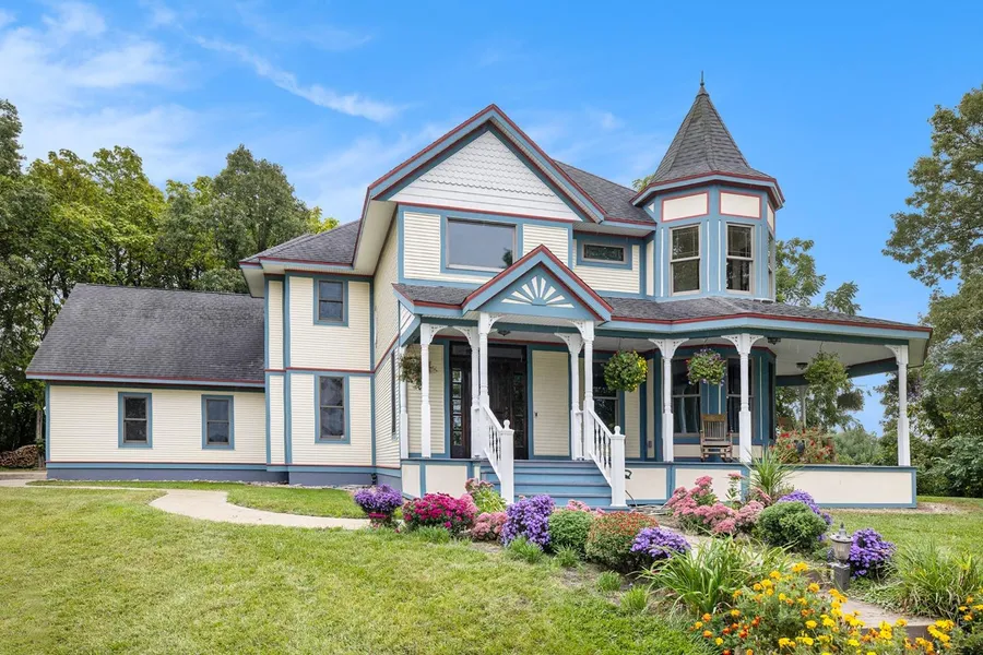 This modernly built Queen Anne Victorian style home, with nearly 5,000 square feet of space, proudly greets you as though she has stood for 120 years. Entering the home you're greeted by a soaring grand staircase & 10 foot ceilings. Impressive hardwood floors & custom moulding anchor each room. The front parlor is perfect for quiet mornings or lively conversations. The great room with handsome fireplace is flanked by a formal dining room. A home chef's dream, the large kitchen boasts custom Amish built cherry cabinetry, ample counter space & expansive pantry. The primary bedroom serves as a retreat with a walk-in closet, ensuite bath & bright sitting area. Three additional bedrooms, including attached rec room, are all generously proportioned with ample closet space. Storage is never a problem with heated AND cooled garage along with full basement with nearly 1,600 sqft of storage. Outdoor enthusiasts will love the wooded trails & peaceful sunsets from the covered porch. Enjoy LOW taxes ha come with this country living , yet not far from nearby communities. Expansive acreage can be used how you like with income producing crops/hay or pasture for your choice of livestock. This turn-key home is flush with upgrades and waiting for you.