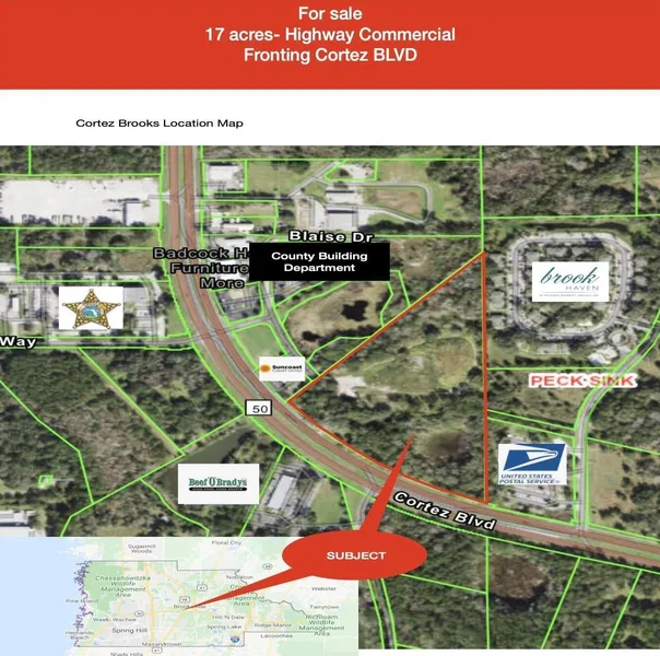 Great 17 acre commercial track with access to city water and sewer. Just over 1,000 feet of road frontage with Annual average daily traffic of 15,500 cars making for great visibility for any business. Located near a Publix and Walmart shopping centers.
