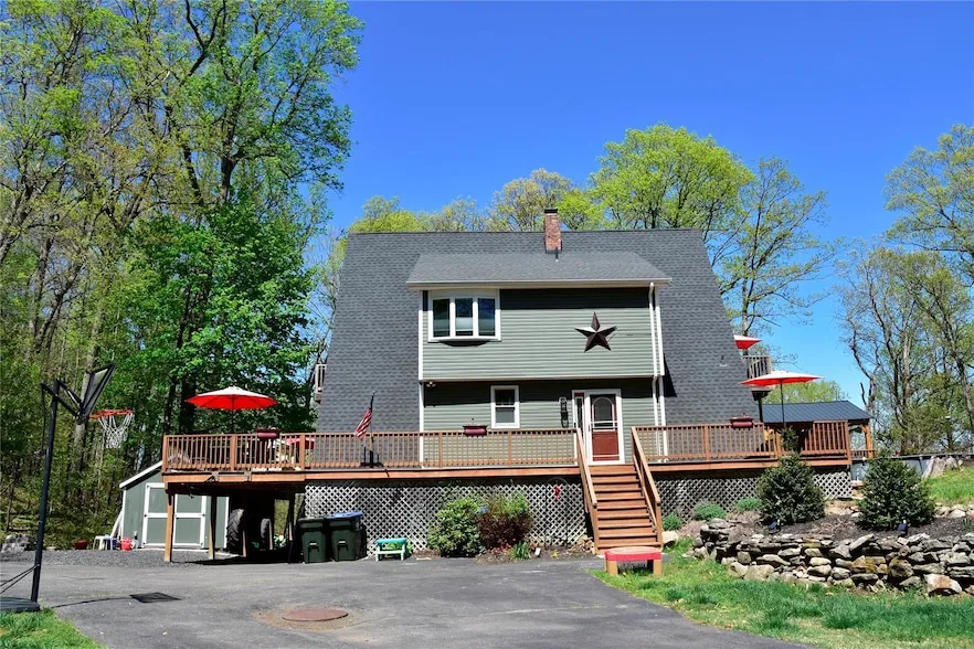 Nestled in a serene cul-de-sac, this stunning A-Frame style home offers breathtaking panoramic views of Mount Beacon and the beauty of the Hudson River Valley. Located in the heart of the Hudson Valley, this contemporary four-bedroom, three-bathroom retreat is a true sanctuary, combining modern living with natural beauty.Spanning 3,740 square feet across three levels, this home features an open-concept design with soaring cathedral ceilings, a wood-burning fireplace, and abundant natural light. The main level boasts a spacious living room, dining area, and a walk-through kitchen that seamlessly flows into the entertainment spaces. Sliding glass doors provide access to a spectacular 360-degree wraparound deck, perfect for enjoying the mountain views.Each floor is thoughtfully designed with at least one bedroom and one bathroom, ensuring privacy and convenience. The master suite, located on the second level, features a private balconyand a walk-in closet. The fully finished walk-out basement adds to the home's versatility, offering a large family room with a wet bar, an additional bedroom, a full bath, an exercise room, and ample storage.Outdoor enthusiasts will appreciate the expansive one-acre lot, complete with an oversized shed, a carport, and parking for six or more vehicles. Enjoy the convenience of nearby Metro-North access, major highways, shopping, restaurants, and hiking trails all while relishing the tranquility of your private oasis.Don't miss the opportunity to own this unique Hudson Valley gem, where luxury meets nature in perfect harmony.